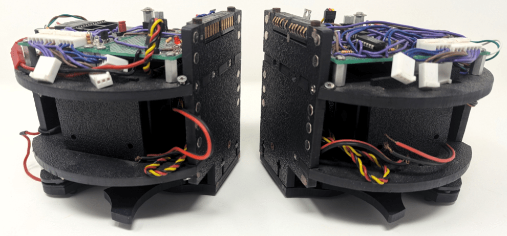 The robots connected through magnetic surfaces, carefully designed with specific polarities to snap into place when close enough. Once combined, electrical communication between the robots was established via brush blocks, allowing them to share data and act as one.
