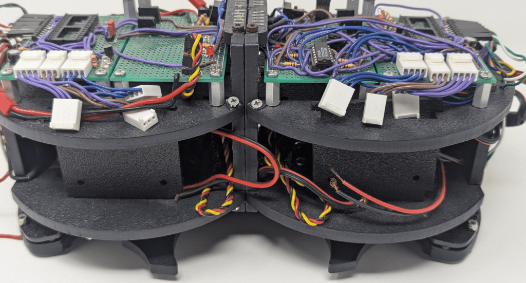 When connected, only one microcontroller (MCU) took charge, seamlessly transferring control of the “slave” robot’s motors to the “master” robot. This was accomplished using tri-state buffers as logic gates to route motor commands through the brush block interface.